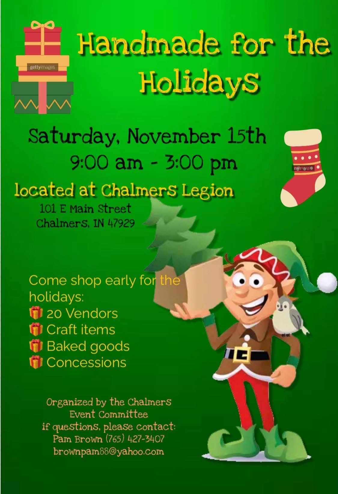 Homemade for the Holidays Saturday, November 15th, 2025, 9:00 AM to 3:00 PM at the Legion Bldg. There will be food available and 20-25 vendor booths.